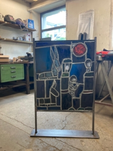 Mit Hilfe von Schwerzmann Metallbau Zug konnte eine sehr smarte Lösung gefunden werden. Dank eines patinierten Eisenrahmens kann die Glasmalerei nun flexibel präsentiert und bei passender Gelegenheit ins Zentrum der Aufmerksam gerückt werden.