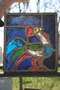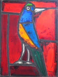 Dieses farbenfrohe Glasbild zeigt einen stolzen Hahn. Das eher kleine Werk (Breite: 23 cm / Höhe 26 cm) ist ebenfalls vom Künstler signiert und im Verzeichnis registriert (M-290). Gian Casty hat diesen Hahn in drei ähnlichen Versionen hergestellt.
