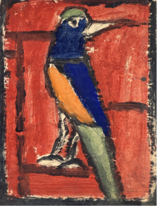Diese 29,6 cm hohe und 17,0 cm breite Glasmalerei ist unten links signiert und stammt aus der späten Schaffensphase des Künstlers (ca. 1977). Das im Werkverzeichnis registrierte Kunstwerk (M-190) erzählt die Legende über den heiligen Franz von Assisi, wie er einst zu einer großen Schar Vögel predigte.
